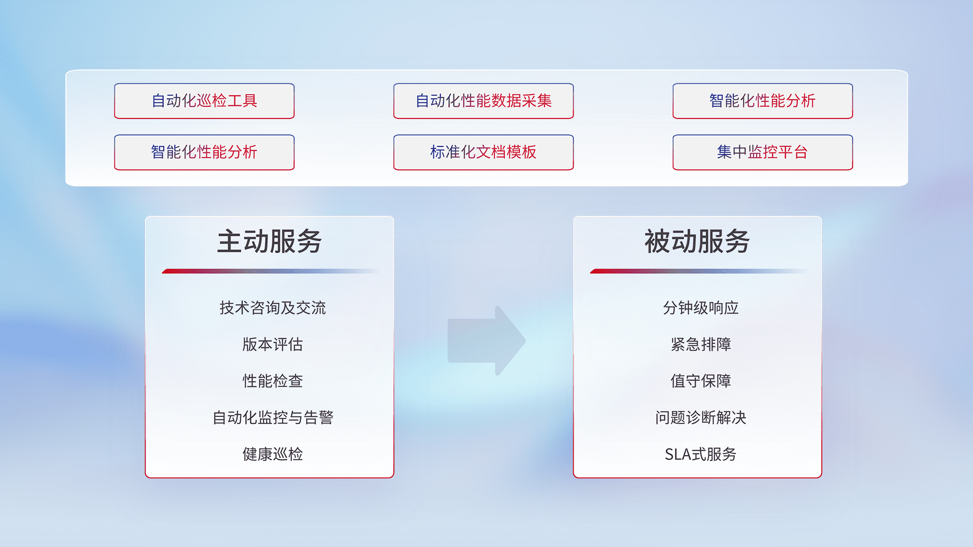 智能化工具和标准化文档,,,,保障服务质量,,,,提供主动服务(包含技术咨询、、、、版本评估、、、、性能检查、、自动化监控与告警、、健康巡检)和被动服务包含(分钟级响应、、、、紧急排障、、值守保障、、、问题诊断解决、、、SLA服务)。。。。